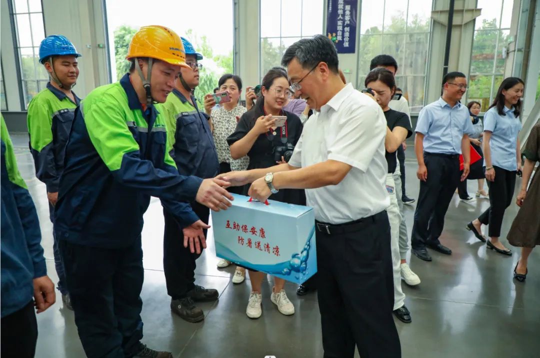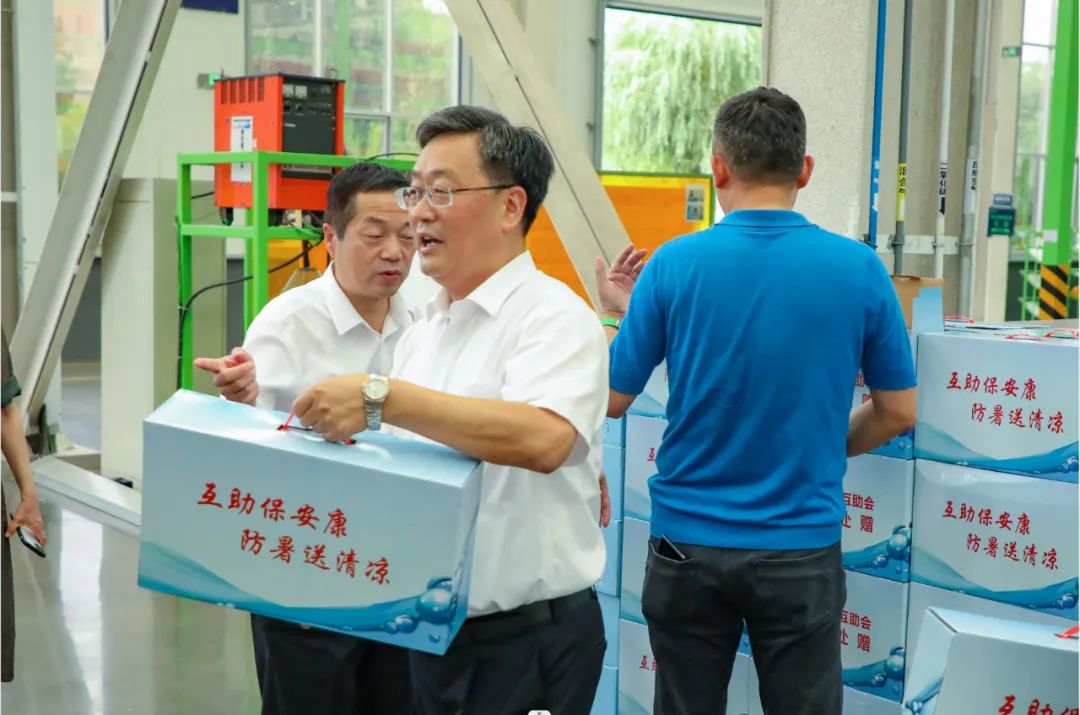 “关爱职工生活,促进安全生产”慰问组一行人走进生产车间,走访慰问坚守工作岗位的一线职工,为他们送去茶叶、水杯、洗化用品、毛巾、盐汽水等降温防暑等物品,并叮嘱他们增强自我保护意识,注意防暑降温。